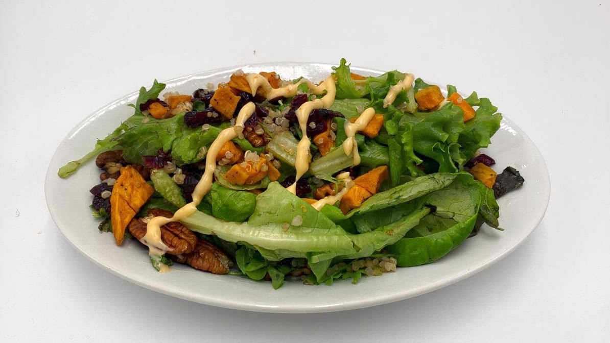 Spring mix, Quinoa, Sweet potatoes, Cranberries, Pecans, and a special dressing. (24 oz)